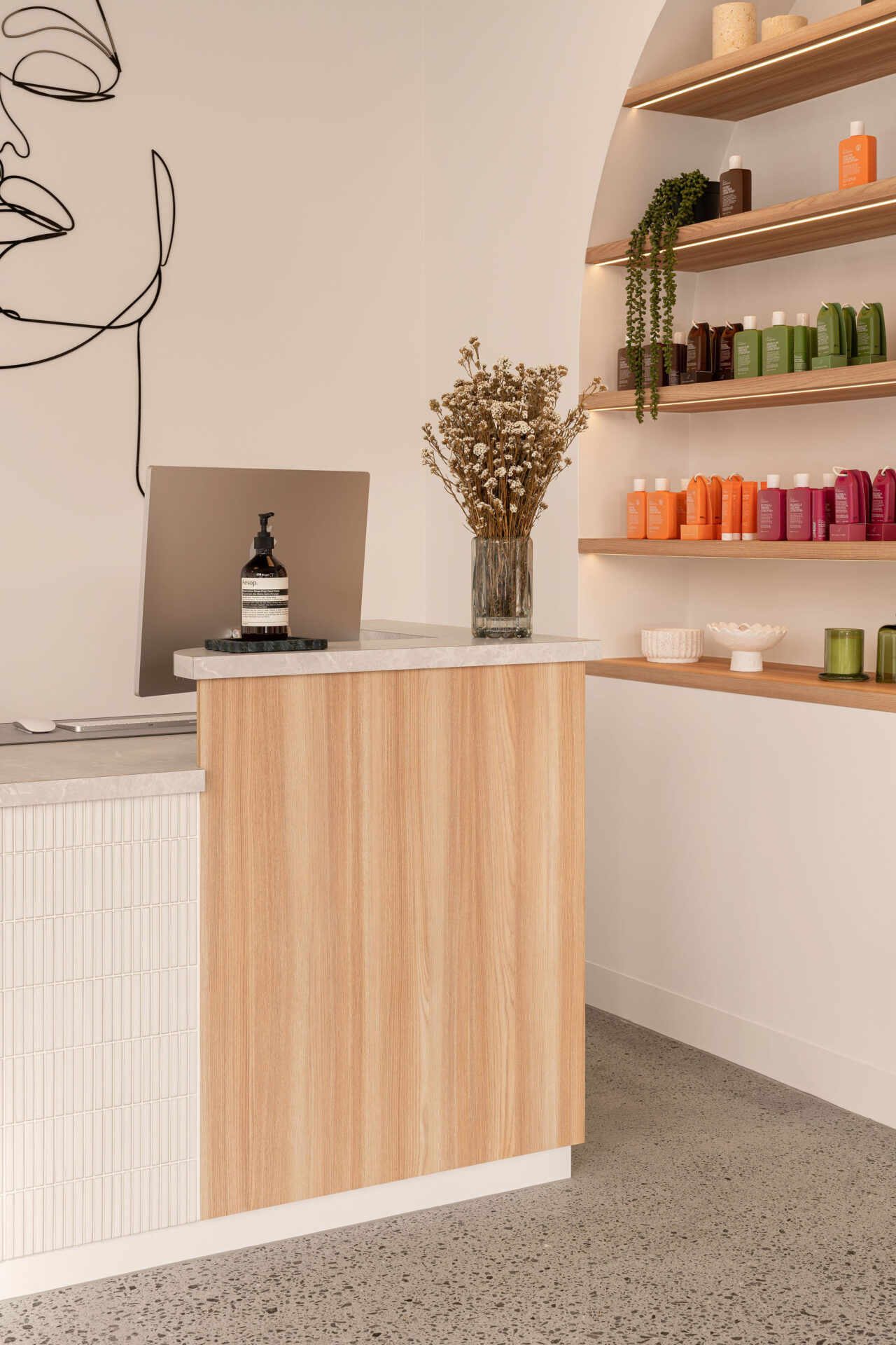 Cassandra Lehmann, designer at Lehmann Design says, “Timber features are thoughtfully introduced in areas like cabinetry and shelving, helping balance the cooler concrete floor and pale walls. This use of natural material adds warmth without overpowering the space, reinforcing Future Face’s organic and holistic approach to beauty.”
