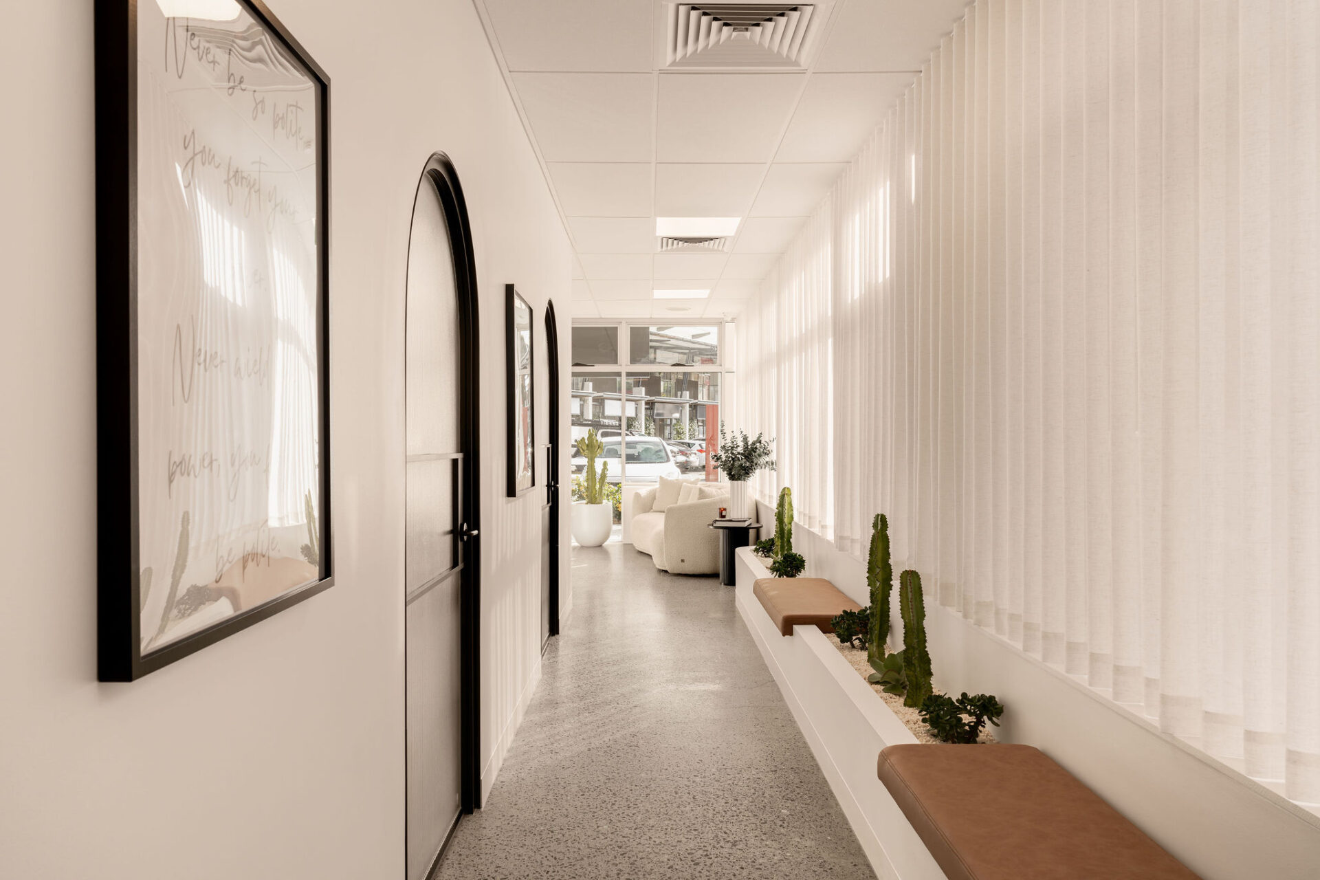 Vertical sheer curtains line the main hallway of the commercial beauty fitout, adding texture and subtle movement. They diffuse natural light softly into the corridor, amplifying the feeling of openness while still providing privacy. Beneath the windows sits an integrated planter with brown leather-look bench seating—a beautiful example of function meeting design. The inclusion of low-maintenance cacti and succulents adds a touch of green, connecting the internal environment to nature while reinforcing the brand’s focus on fresh, radiant skin.