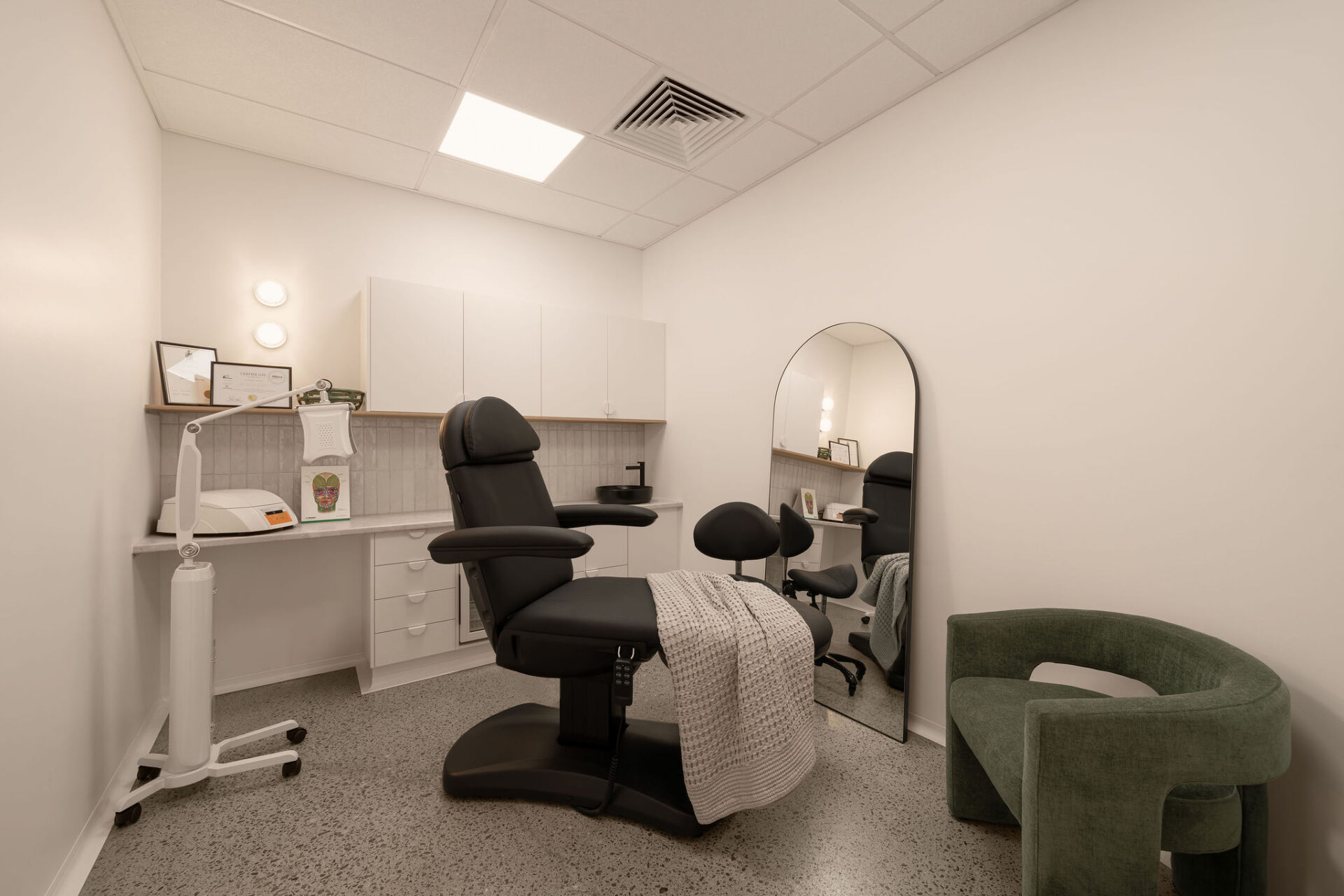 The use of polished concrete flooring gives the commercial beauty fitout a modern, tactile base that is both practical and refined. Durable and easy to clean, it suits the high-traffic nature of the clinic while still contributing to the overall design language.