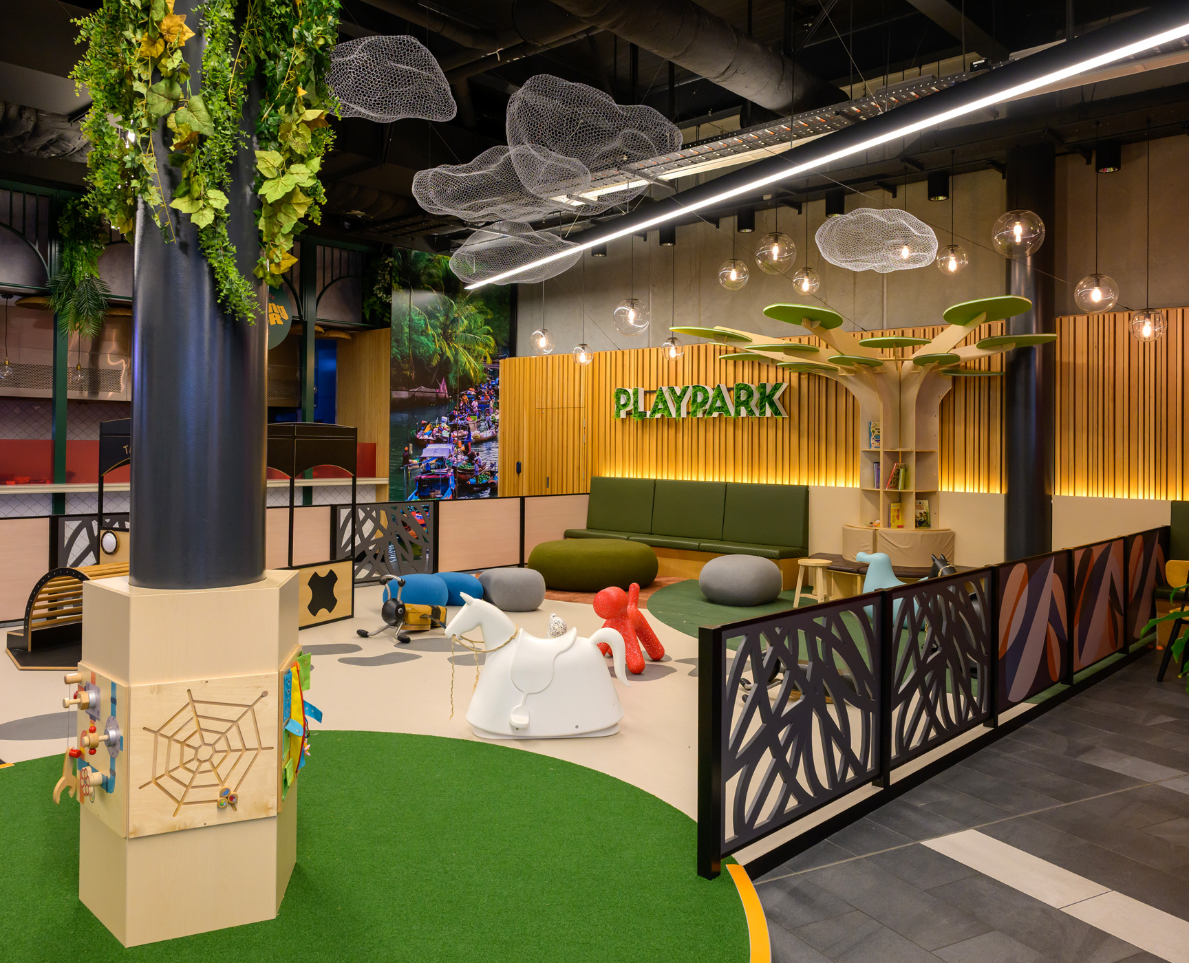 The perimeter of the Play Park is defined by a low, custom-designed fence. This fence, featuring an intricate, laser-cut pattern of intertwined branches, is more than just a barrier. It acts as a visual connection to the central tree element and the overall nature-inspired theme, while also providing a clear boundary for the play area. The fence design is elegant and sophisticated, demonstrating that a space for children can still be a part of the mall’s overarching, modern aesthetic. The images also reveal a background of warm, vertical wood panelling, a recurring motif that softens the space and adds a layer of texture and warmth.